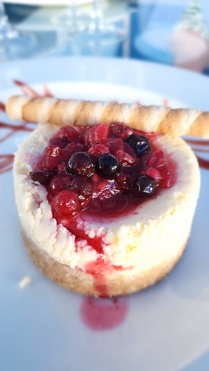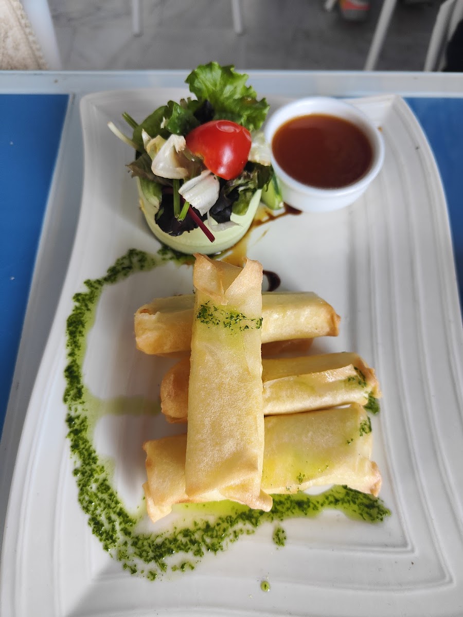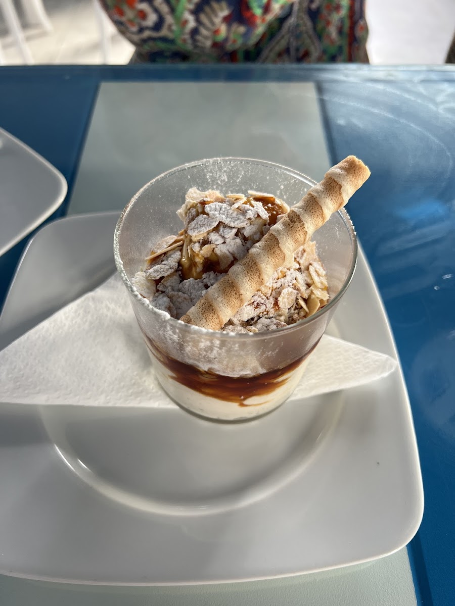 We came here for lunch, and it was okay overall. Nothing spectacular, but it was nice to sit on the veranda and enjoy the breeze. The upper level is decorated in blue and white, which looks great and adds a pleasant vibe. We had fresh fish, which was fine—not bad, but not particularly memorable either. Hard to say whether it was the fish itself or the preparation. The salad was nicely presented, the croquetas were okay. The mango panna cotta was tasty, while the cheesecake was average.